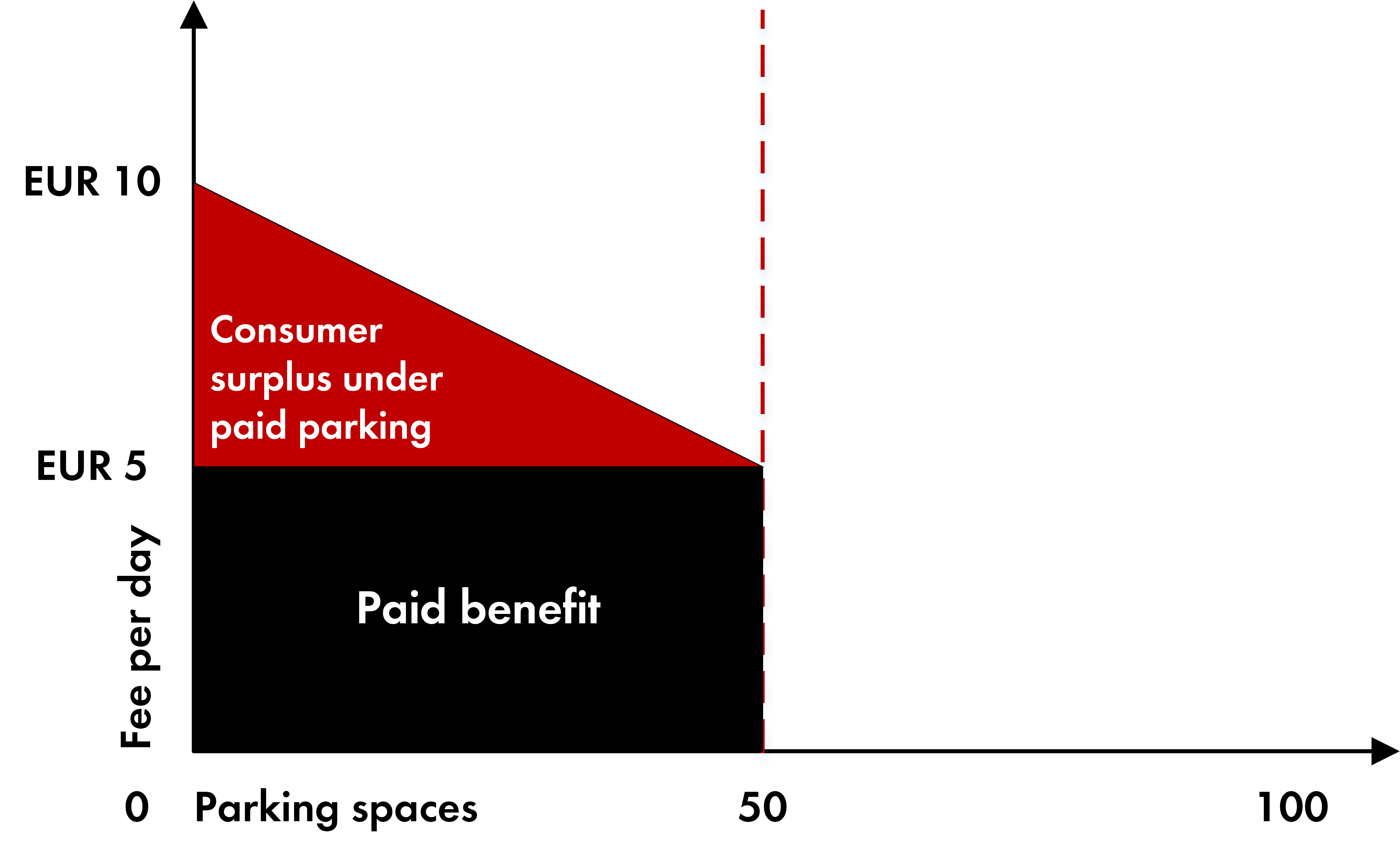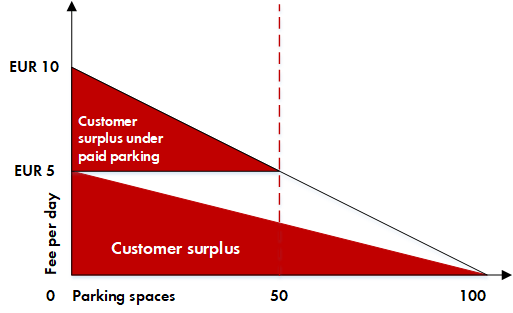 Specifically, if the number of spaces is reduced by 50%, the utilisation of a space is also discounted if parking is kept free of charge. The reduced red area therefore represents the probabilistic consumer surplus.