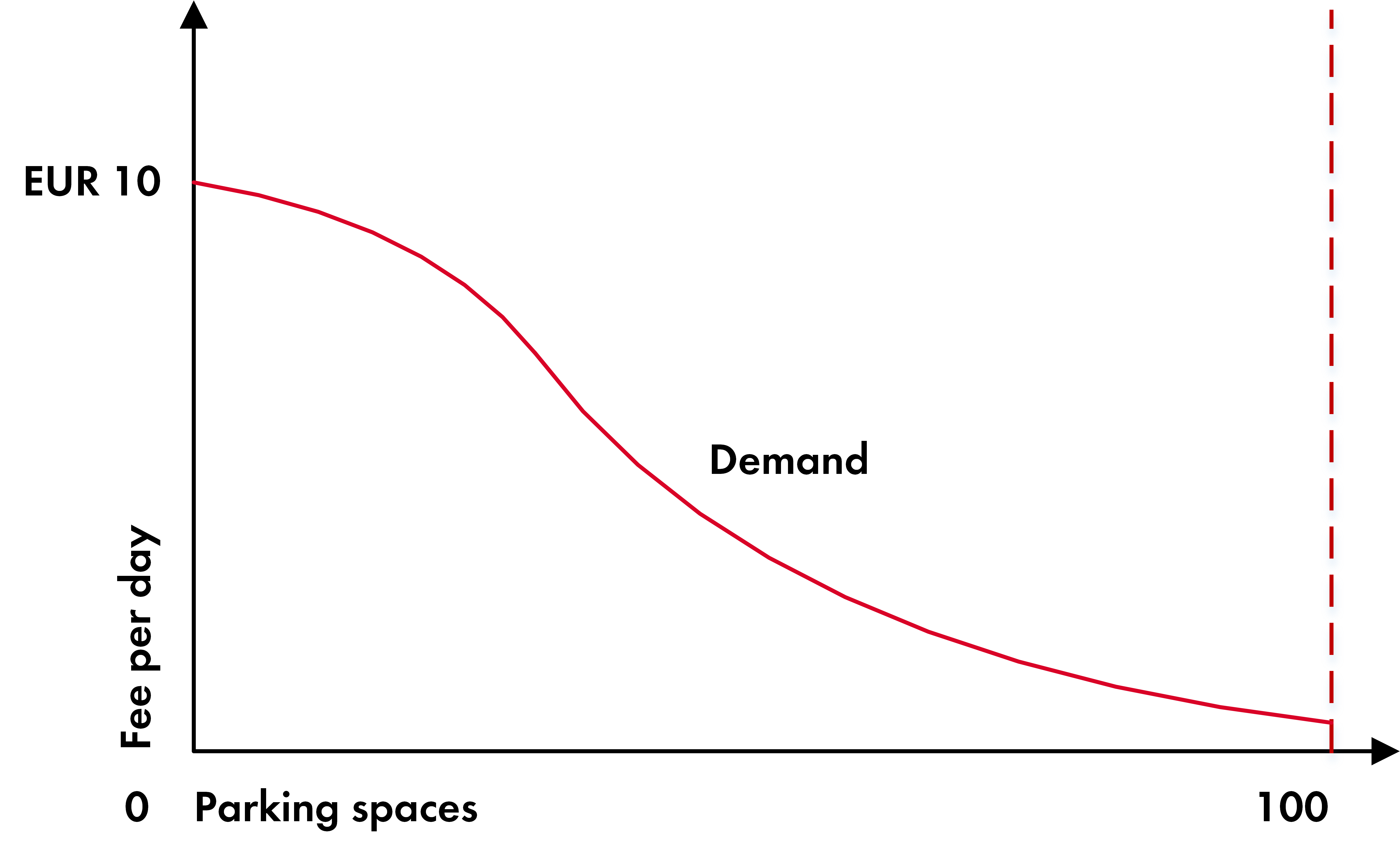 For the sake of simplicity, the graphic representations of demand and price comparisons in this article are represented by a straight line. In reality this would be a curve, converging at infinity on the number of parking spaces axis.