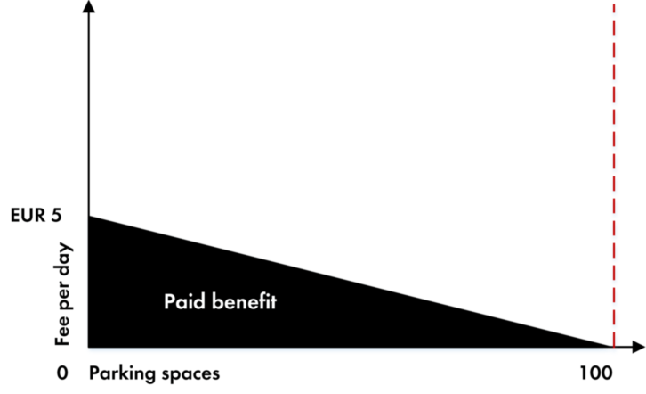 Lorsque le nombre de places de stationnement est égal ou supérieur au nombre d’automobilistes souhaitant se garer, le stationnement gratuit entraîne une utilisation optimale ; toutes les places de stationnement sont utilisées. Cette utilisation est représentée par la zone rouge sous la ligne de demande.